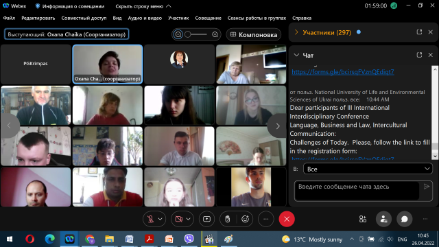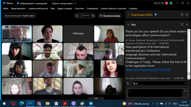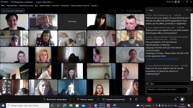 Два дні поспіль пройшли у плідній співпраці й наукових обговореннях учасників ІІІ Міжнародної міждисциплінарної науково-практичної конференції «Мова, бізнес і право, міжкультурна комунікація: виклики сьогодення», що відбулася 26-27 квітня 2022 року за організації кафедри іноземної філології і перекладу та гуманітарно-педагогічного факультету НУБіП України.