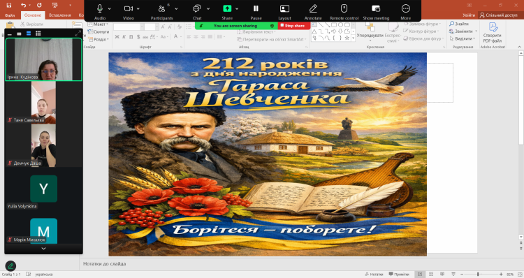 Учасники кураторської години також декламували поезію Кобзаря, ділилися власними думками щодо значення його творчої спадщини та обговорювали роль Шевченкового слова у формуванні української ідентичності.