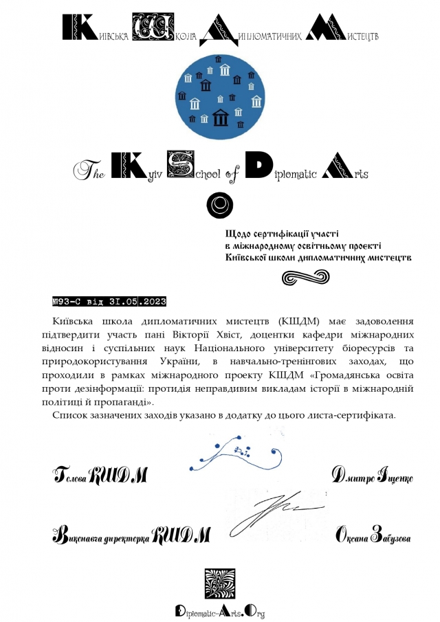 Викладачі кафедри міжнародних відносин і суспільних наук взяли персональну участь у даному міжнародному проекті Київської школи дипломатичних мистецтв, за що отримали від виконавчої директорки Оксани Володимирівни Забузової велику подяку за співпрацю впродовж надважкого 2022-2023 навчального року та сертифікати за участь.