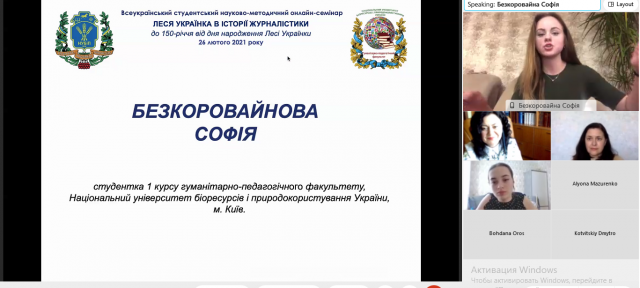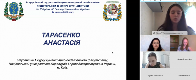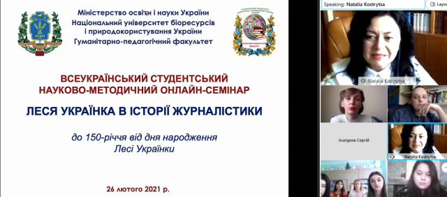 26 лютого 2021 року в рамках IV очно-дистанційної Міжнародної науково-практичної конференції «Соціокомунікативний простір України: історія та сьогодення», присвяченій 150-річчю від дня народження Лесі Українки, відбувся Всеукраїнський студентський науково-методичний онлайн-семінар «Леся Українка в історії журналістики». Серед учасників семінару – студенти як гуманітарно-педагогічного факультету, так й інших факультетів Національного університету біоресурсів і природокористування України, старшокласники та випускники ліцеїв, гімназій та шкіл з різних регіонів України. Тематика семінару була спрямована на збереження та популяризацію спадщини Лесі Українки в контексті журналістики серед студентів та абітурієнтів.