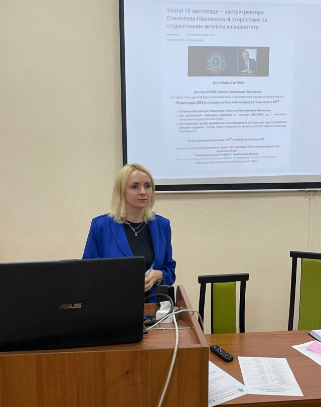 У своєму виступі заступник декана Ігор Буцик наголосив на актуальних питаннях, що стосуються особливостей діяльності та обов'язків старост академічних груп, дотримання корпоративної етики, наголосив графіку проходження заліків та іспитів, формуванні рейтингу студентів та впливу додаткових балів на призначення стипендій, що прописано у «Правилах призначення академічних стипендій у Національному університеті біоресурсів і природокористування України»