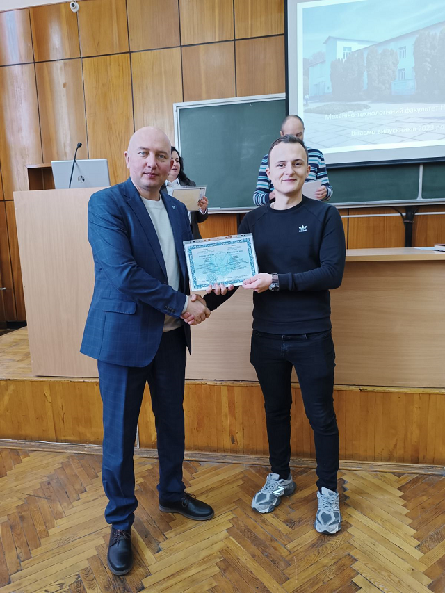 До вітань доєдналася заступник декана механіко-технологічного факультету Оксана Ачкевич, яка відмітила що навчатися в цей непростий час було вкрай важко, але випускники впоралися зі всіма випробуваннями. Також Оксана Миколаївна продемонструвала вітання від деканату – колаж зі світлин подій та заходів за участі випускників під час їх навчання в університеті.