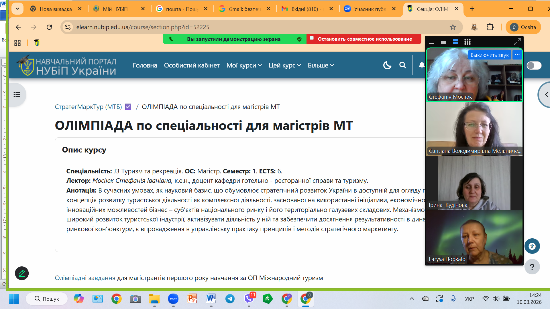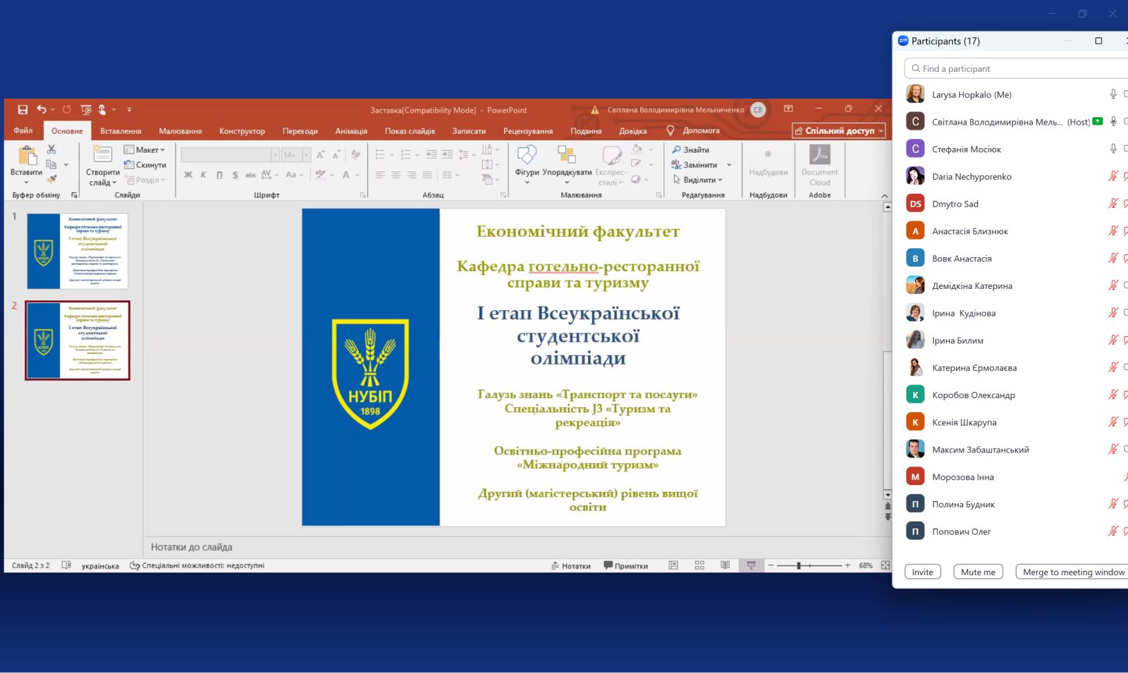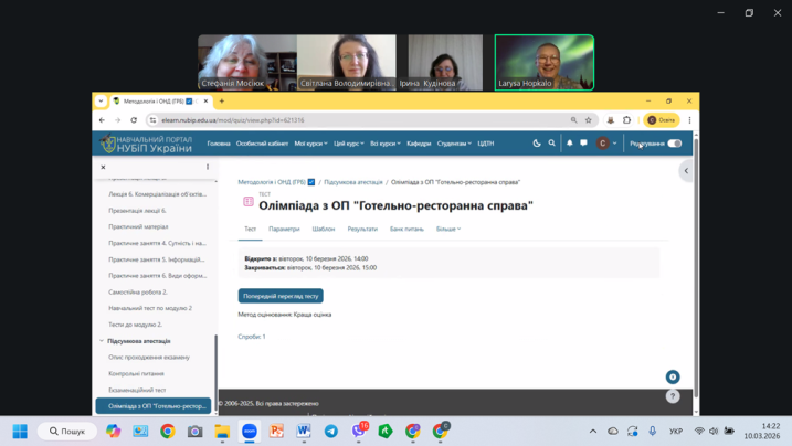 10 березня 2026 року на кафедрі готельно-ресторанної справи та туризму економічного факультету НУБіП Українивідбувся перший етап Всеукраїнської студентської олімпіади серед здобувачів другого (магістерського) рівня вищої освіти спеціальностей J2 «Готельно-ресторанна справа та кейтеринг» ОП «Готельно-ресторанна справа», J3 «Туризм та рекреація» ОП «Міжнародний туризм».