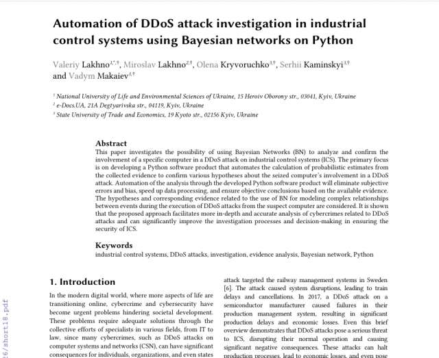Публікація була здійснена в науковій базі Scopus, що підтверджує високий рівень наукового внеску авторів у сферу кібербезпеки та промислових технологій. У підготовці статті взяв участь магістр спеціальності 123 "Комп'ютерна інженерія" Вадим МАКАЄВ, який активно долучався до наукового дослідження під керівництвом професора Валерія ЛАХНА. Спільно з іншими Вадим досліджував новітні методи боротьби з DDoS-атаками, зокрема, використанням байєсівських мереж для прогнозування та виявлення атак у реальному часі. Робота має великий науковий потенціал, адже розв'язання задач, пов'язаних із забезпеченням безпеки промислових систем, стає надзвичайно актуальним у сучасному світі, де зростає число кібератак на критичні інфраструктури. Використання методів машинного навчання, зокрема баєсівських мереж, дозволяє значно підвищити ефективність виявлення та запобігання кібератакам.