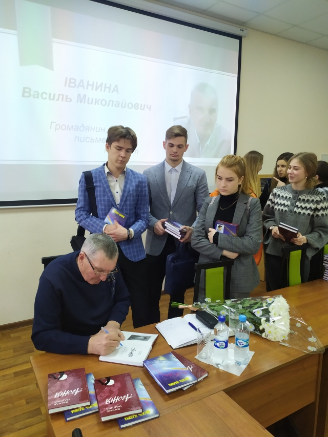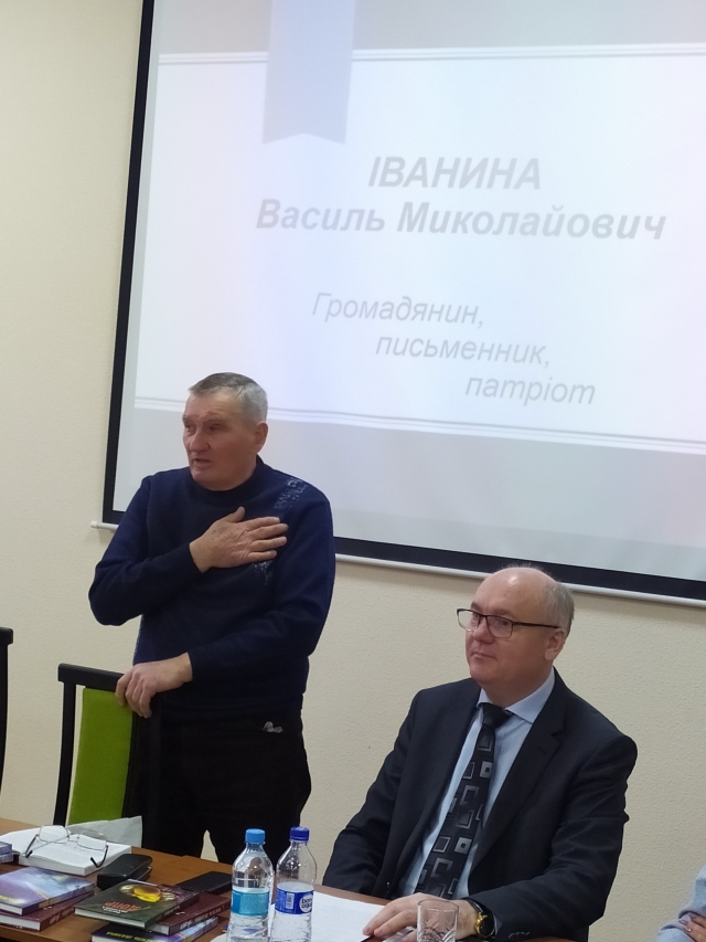 На гуманітарно-педагогічному факультеті відбулася творча зустріч з українським письменником Василем Іваниною – надзвичайно цікавою особистістю, талановитим, а головне небайдужим до долі української держави письменником, що подарував багато творів, між якими «Полин ‒ люби-мене ‒ не покинь» (1997), «Агонія» (2004), «З неба зіронька упала» (2013), «Брати» (2016).