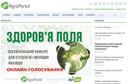 Онлайн-видання AgroPortal.ua спільно з компанією AgriLab та за підтримки Науково-методичного центру вищої та фахової передвищої освіти України влітку розпочали Всеукраїнський конкурс для студентів аграрних закладів освіти та молодих фахівців «Здоров’я поля».