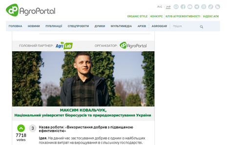 Агробіологічний факультет Національного університету біоресурсів і природокористування України представив магістр ОПП «Агрохімсервіс у прецизійному агровиробництві» Максим Ковальчук із науковою роботою на тему «Використання добрив з підвищеною ефективністю», яка була розроблена у межах роботи студентського наукового гуртка «Управління якістю продукції рослинництва у сучасних технологіях». (Науковий керівник Надія Бордюжа, доцент кафедри агрохімії та якості продукції рослинництва ім. О.І. Душечкіна). Ця наукова розробка стала гідною спочатку півфіналу, а потім і перемоги у Всеукраїнському конкурсі «Здоров’я поля».