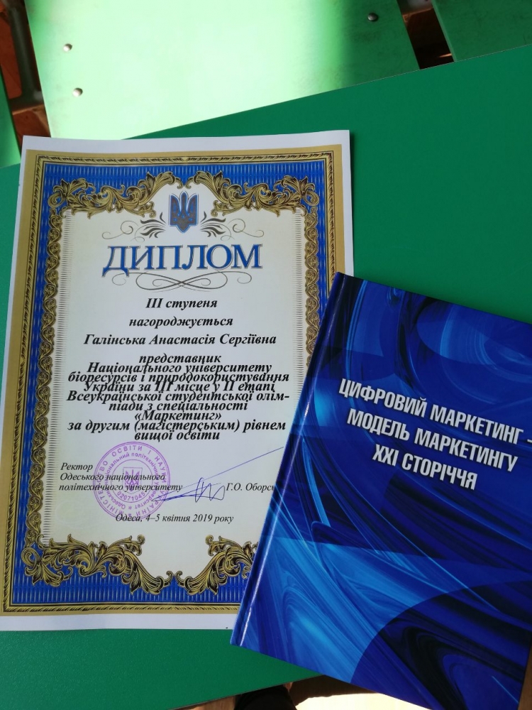 Олімпіада пройшла в два етапи: теоретичному (50 тестових завдань) та практичному (4 розрахункові задачі). Серед магістрів з маркетингу студентка 1-го року навчання Галінська Анастасія Сергіївна посіла 3-те місце у Всеукраїнській студентській олімпіаді зі спеціальності "Маркетинг" серед вищих навчальних закладів III–IV рівнів акредитації з ОС «Магістр».