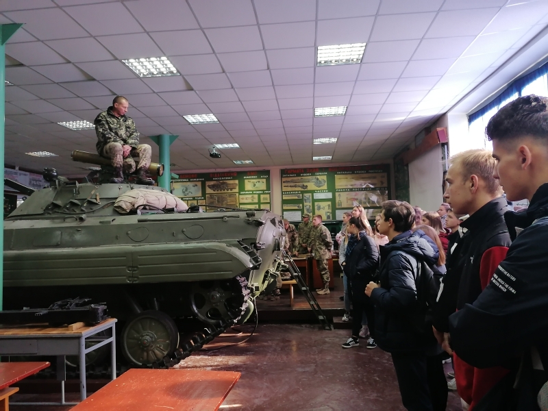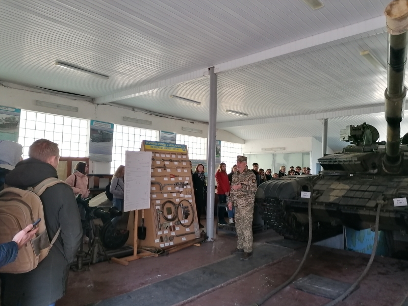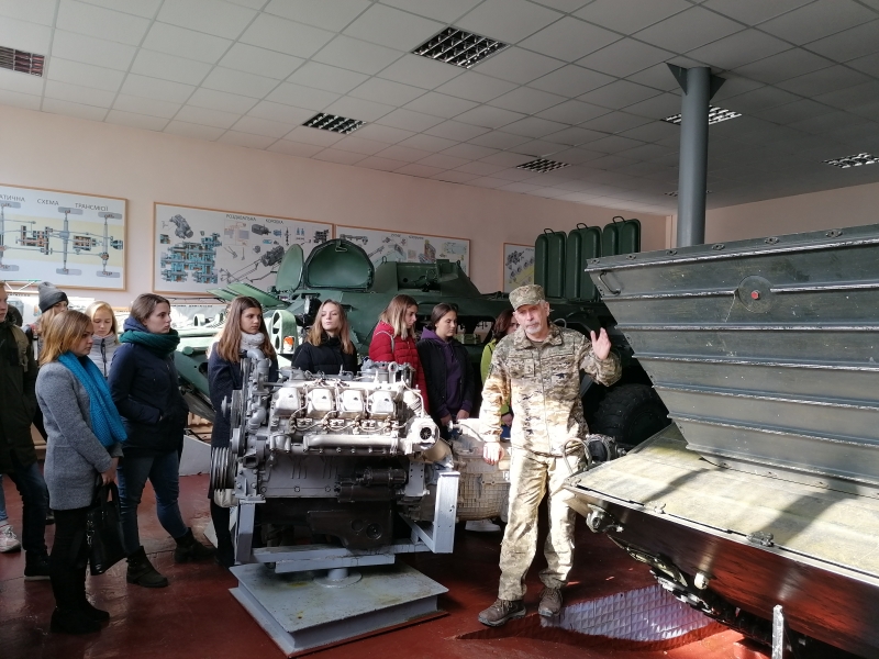 Найцікавішою частиною екскурсії стало ніщо інше як військова техніка. В розпорядженні кафедри є справжній діючий танк Т-64. Чоловіча частина студентів була в захваті! Нам розказали про будову, експлуатацію та можливості танку. Вразило те, що це єдиний танк, що є повністю герметичним і здатним рухатися під водою на величезні відстані. Також був продемонстрований БТР та бойова машина для транспортування піхоти. При кафедрі наявний симулятор кабіни танку і тир, де студенти відпрацьовують навички влучної стрільби із різноманітної зброї.