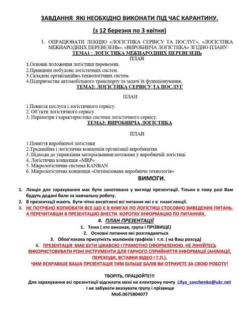Для зручності опрацювання теоретичного матеріалу студентам, також, надано перелік додаткових інтернет-джерел стосовно тематики, яка вивчається. Контроль за виконанням завдань студентами, здійснюється на електронній платформі університету Elearn, за допомогою електронних скриньок викладачів та комунікативного оператора Viber. Виконання практичних занять, обов’язково завершується створенням презентації, яка надсилається викладачу. Для студентів, які через погане інтернет-покриття, не завжди мають змогу якісно опрацьовувати матеріал на Elearn - створені альтернативні курси на платформі Google Classroom.
