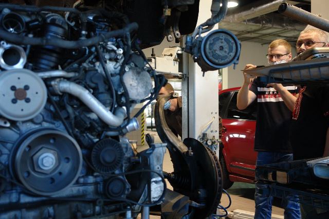 В технічній зоні ми мали можливість спостерігати операцію зі знімання двигуна за використанням візка-кондуктора та основну будову силового агрегату автомобіля Porsche. Зразу виникло питання: «що об’єднує трактор Т-150К, автомобіль ЗАЗ 968 та Порше «Cayenne Coupé Turbo»? Питання було нестандартне, але відповідь проста: це «V»-подібний двигун на 6 циліндрів. Про це знає тільки інженер. Будова однакова, але сучасні технічні рішення різні, та і матеріал для виготовлення суттєво відрізняється.