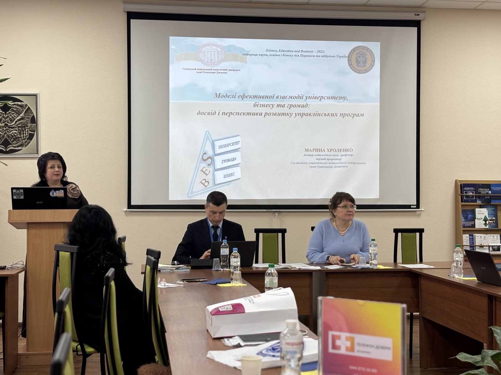 У своїй доповіді Перший проректор Глухівського національного педагогічного університету імені Олександра Довженка, доктор педагогічних наук, професор Марина ХРОЛЕНКО розкрила Моделі ефективної взаємодії університету, бізнесу та громад: досвід і перспективи розвитку управлінських програм. Вона визначила, що сьогодні Університет - суб’єкт інноваційних змін і основа взаємодії з громадами та бізнесом. Доповідачка наголосила на основній моделі співпраці з громадою – інституційно-соціально-економічній взаємодії на основі системо утворюючої ролі університету, його ролі в регіональному становленні. Акцент на синергії освіти науки та інновацій, що дозволяє посилити регіональний розвиток 30 000 громади м. Глухова. В 2025 році Університет виграв гран на 700 тис грн. на цифровізацію пам`яток культури Глухівського регіону. Для цього було запропоновано гібридну модель співпраці – цифрова колаборація: сталий розвиток, культура, освіта. Мета – за допомогою цифрових технологій зберегти культурну спадщину регіону.