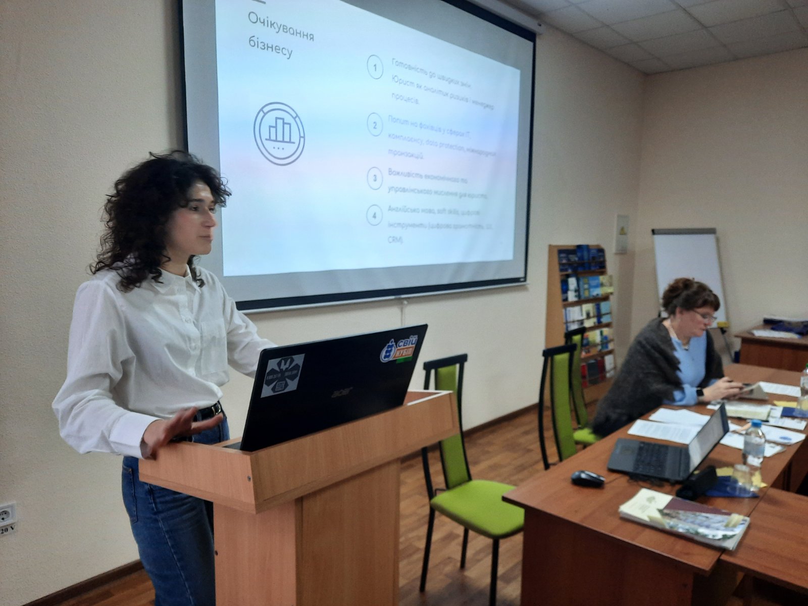 Продовжуючи розмову, юристка практики ІТ/ТМТ АО «МК Лігал Сервіс Анна МИТРОПАН наголосила на необхідності формування практичних навичок взаємодії юридичного бізнесу з підготовчим навчальним закладом. Виклики в бізнесі – наявність практичних знань та навичок та роль університету в підготовці фахівця.