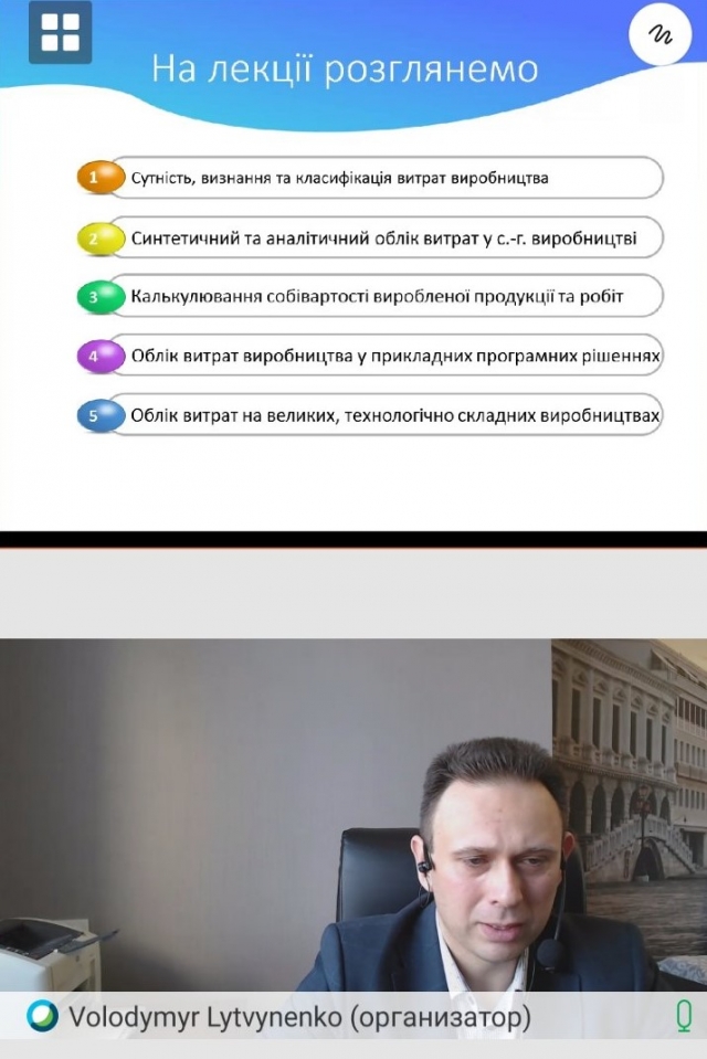 3 березня 2021 р. відбулася відкрита оn-line лекція к.е.н., доцента кафедри обліку та оподаткування Литвиненка Володимира Сергійовича з дисципліни "Бухгалтерський облік" на тему "Облік витрат виробництва".