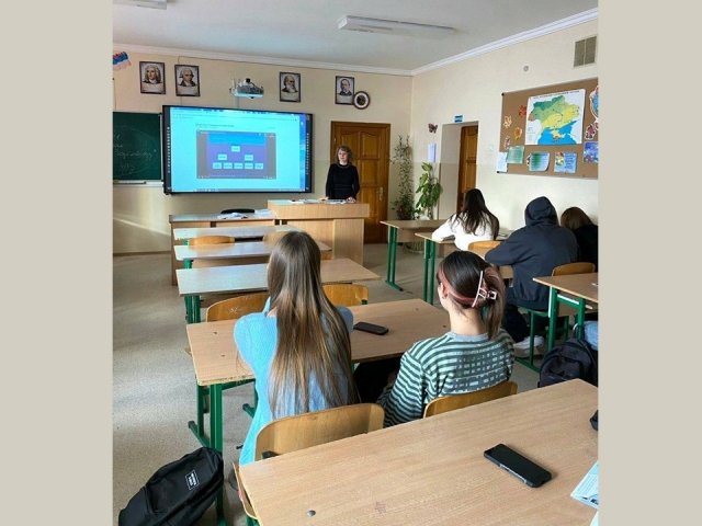 Олена Гафурова ознайомила школярів із роботою кафедри аграрного, земельного та екологічного права ім. академіка В.З. Янчука. Вона наголосила на пріоритетності цього блоку дисциплін у сучасних умовах, їх надважливій ролі у формуванні механізму захисту прав селян та природних прав усіх українців на безпечне навколишнє середовище. Пані Олена відмітила, що навіть у воєнні часи Україна займає важливе місце у забезпеченні продовольчої безпеки інших країн світу. У цікавій та зрозумілій формі, з використанням практичних прикладів, вона розповіла про зародження спільної сільськогосподарської політики ЄС, розвиток сільського туризму в Україні та зарубіжних країнах і роль права у цих процесах. Враховуючи виклики війни та курс нашої країни на інтеграцію до Європейського Союзу, Олена Гафурова звернула увагу на формування нових напрямів роботи юристів у галузі аграрного, земельного та екологічного