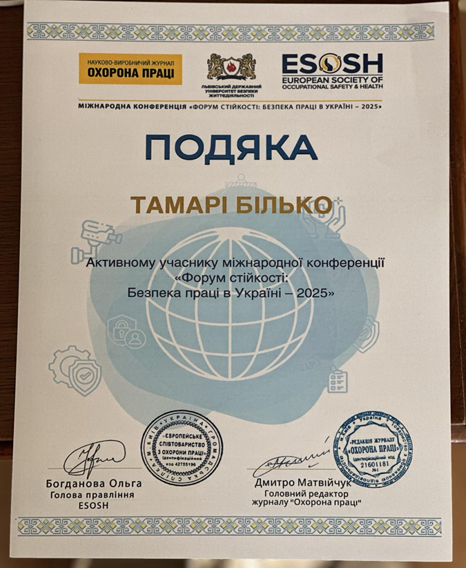 Європейське співтовариство з охорони праці (ESOSH), журнал «Охорона праці» та Львівський державний університет безпеки життєдіяльності (ЛУБЖД) провели щорічний безпековий захід, який відбувся Львові. Доцентка кафедри охорони праці та біотехнічних систем у тваринництві НУБіП України Тамара БІЛЬКО взяла участь та виступила з доповіддю на Міжнародній конференції “Форум стійкості: безпека праці в Україні -2025” та отримала Подяку за активну участь.