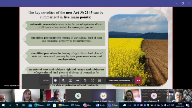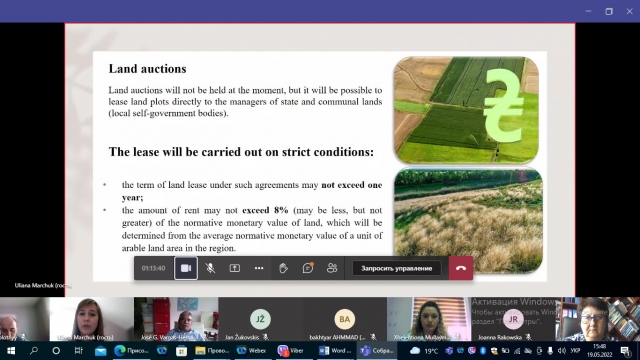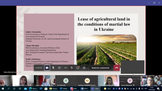 Спільною була доповідь завідувача кафедри обліку та оподаткування Національного університет біоресурсів і природокористування України, д.е.н., професора Любові Гуцаленко, доцента кафедри бухгалтерського обліку та моніторингу ДВНЗ «Київський національний економічний університет імені Вадима Гетьмана» к.е.н., доцента Ульяни Марчук та доцента кафедри фінансів інституту економіки і фінансів Варшавського університету природничих наук –SGGW, к.е.н., доцента Сергія Заболотного на тему: «Оренда земель сільськогосподарького призначення в умовах воєнного стану України».
