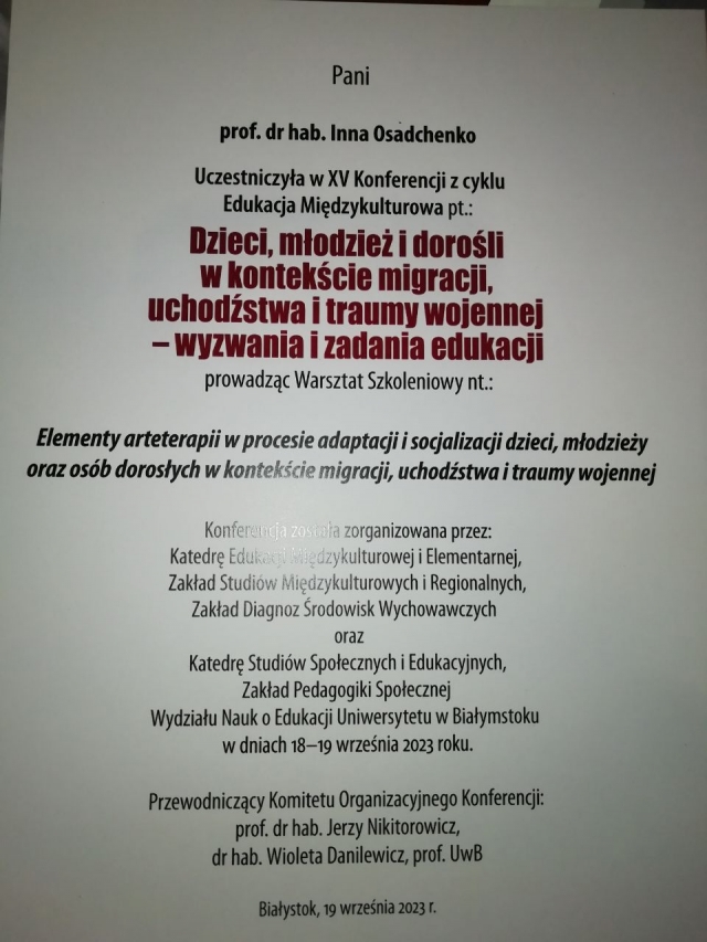 18-19 вересня 2023 р. докторка педагогічних наук, професорка, професорка кафедри соціальної роботи та реабілітації Осадченко Інна Іванівна на персональне запрошення брала участь у XV Міжнародній науково-практичній конференції «Діти, молодь і дорослі у контексті міграції, біженства і воєнної травми – виклики і завдання освіти» з циклу «Міжкультурна едукація», що відбулася в Університеті у Білостоку (Республіка Польща) на Відділі наук про едукацію (декан – проф. Мірослав Собєцкі) кафедри міжкультурної та елементарної едукації (завідувач – проф. Єжи Нікіторович).