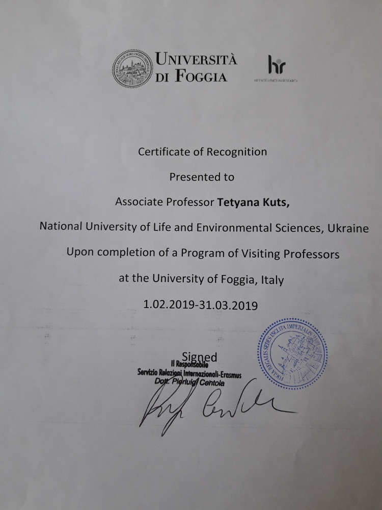 До важливих напрямів діяльності економічного факультету Національного університету біоресурсів і природокористування України слід віднести зміцнення міжнародного науково-дослідницького та освітнього партнерства з вищими навчальними закладами світу. В рамках програми академічної мобільності з 1 лютого по 31 березня 2019 р. доцент кафедри статистики та економічного аналізу Куць Т.В. проходила науково-педагогічне стажування в Університеті Фоджа (Італія) під керівництвом проф. Е. Сіка. У спільному науковому досліджені за темою: «Економічний аналіз кон’юнктури ринку олійних культур» було висвітлено ряд актуальних питань щодо аналізу кон’юнктури на ринку олійних культур; проаналізовано рівні попиту та пропозиції на даних ринках у світі та Україні; узагальнено практичні підходи до економічного механізму регулювання ринку олійних культур та продуктів їх переробки в європейських країнах. Для студентів бакалаврату Куць Т.В. провела лекції на англійській мові з дисципліни «Монетарна економіка», де було розглянуто теоретичні засади до визначення сутності монетарної економіки, науково-практичні підходи до трактування грошей та їх функцій, аналізу грошового попиту та пропозиції, особливості дослідження фінансових ринків, обґрунтування засад грошово-кредитної політики та її впливу на поведінку економічних суб’єктів у макроекономічному контексті.