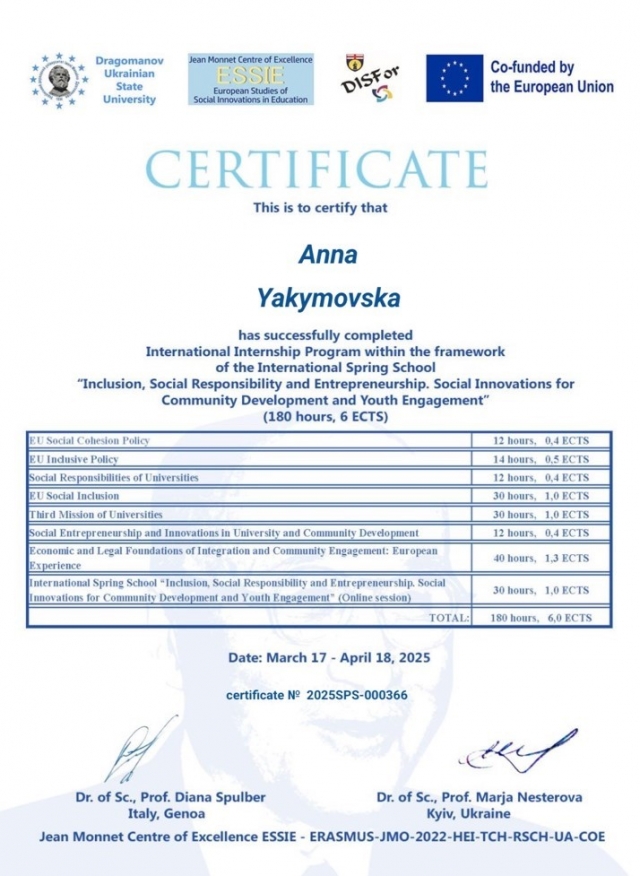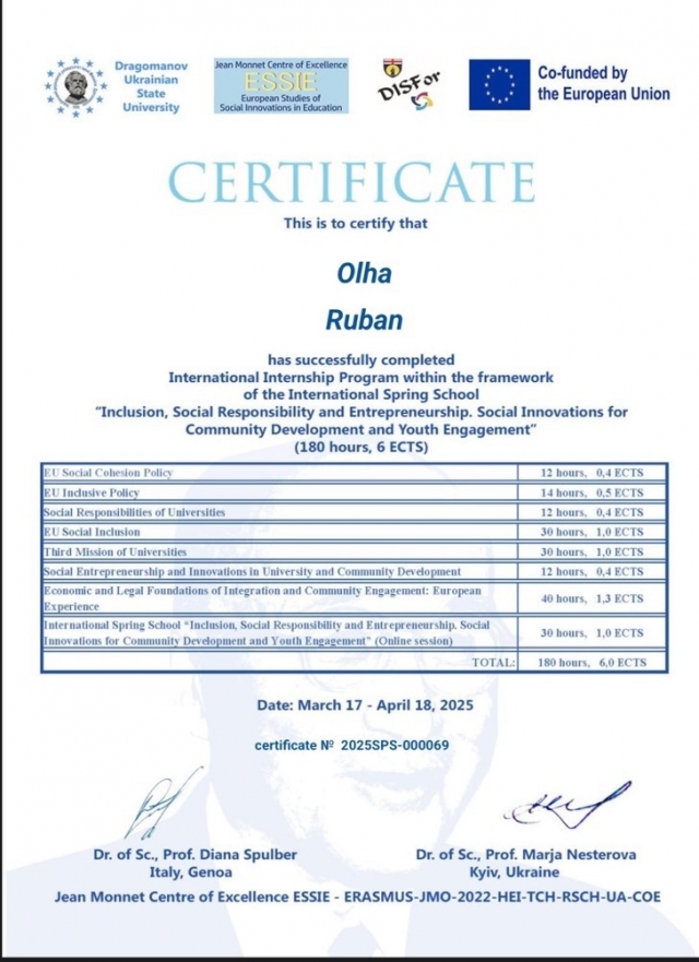 17 березня - 18 квітня 2025 року викладачі кафедри економіки: к.е.н., доцент Ольга РУБАН та старший викладач Анна ЯКИМОВСЬКА, та старший викладач Лариса КОВАЛЕНКО взяли участь в МІЖНАРОДНІЙ ВЕСНЯНІЙ ШКОЛІ «Інклюзія, соціальна відповідальність та підприємництво. Соціальні інновації для розвитку громад та залучення молоді». В рамках Весняної Школи відбулося міжнародне стажування в Університеті Генуї та підвищення кваліфікації від Інституту вищої освіти НАПН України. В програмі були вебінари-тренінги професора Діани Спулбер, воркшопи професора Марії Нестерової, професора Марини Дєліні, провідного наукового співробітника Олени Оржель на теми соціальних інновацій, соціальної відповідальності, соціальної інклюзії. Також для самостійного вивчення було надано курси «Інклюзивна політика ЄС», «Соціальна відповідальність університетів», «Соціальна інклюзія ЄС», «Третя місія університетів» та курс «Соціальне підприємництво та інновації в розвитку університетів та громад», «Європейська політика соціальної згуртованості», «Економічні та правові засади інтеграції та залучення спільнот: Європейський досвід».
