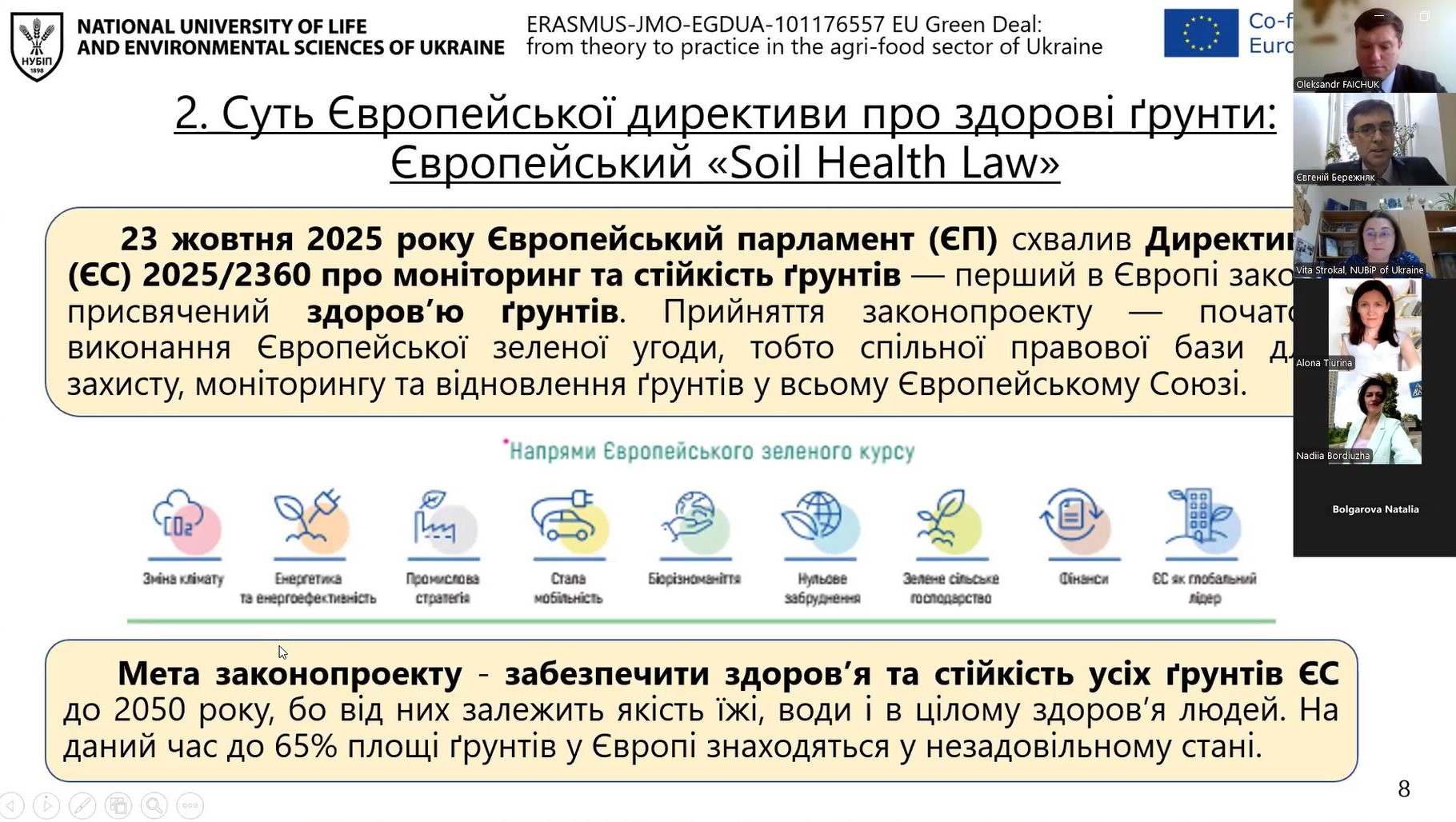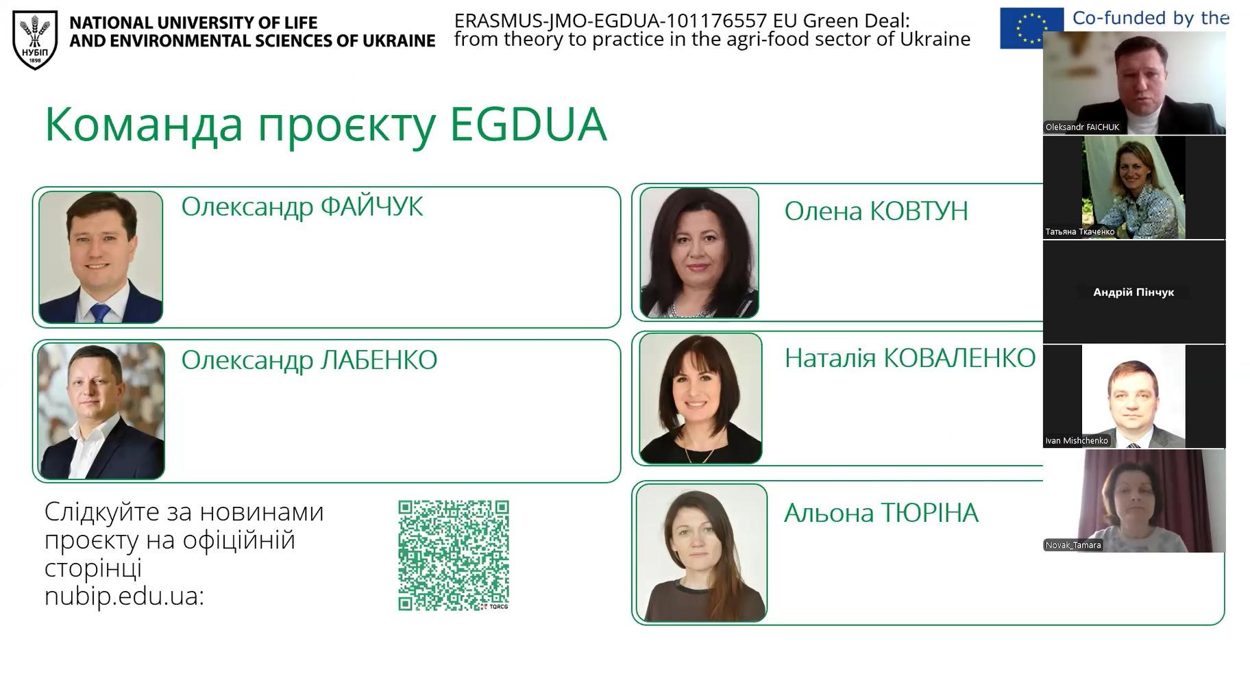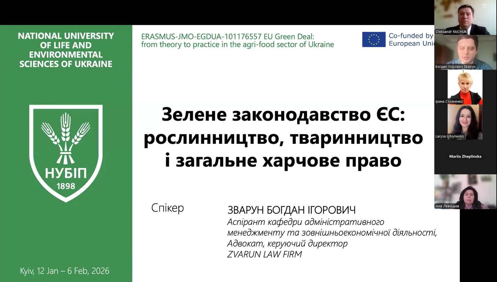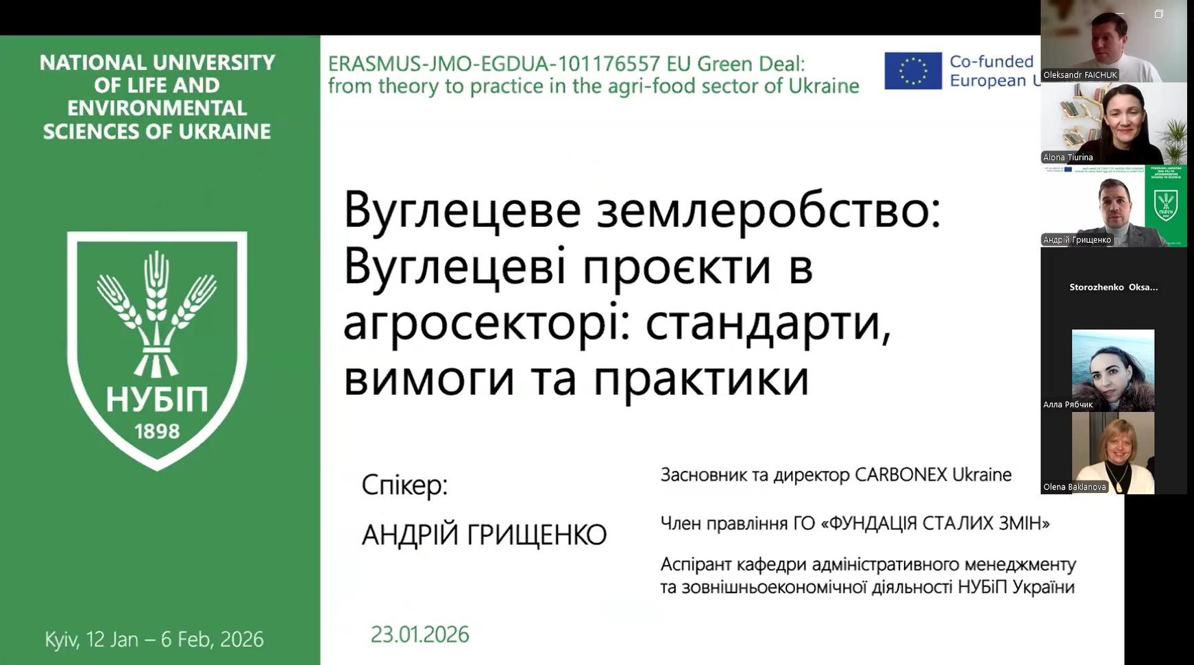 У період з 12 січня по 06 лютого 2026 р. в Національному університеті біоресурсів і природокористування України у форматі Міжнародної зимової школи проходило надзвичайно цікаве й актуальне навчання щодо викликів для агропродовольчого сектору України в рамках реалізації Європейського зеленого курсу. Зимова школа є одним із ключових заходів імплементації проєкту Erasmus+ Модуль Жана Моне «Європейський зелений курс: від теорії до практики в агропродовольчому секторі України» 101176557 – EGDUA – ERASMUS-JMO-2024-HEI-TCH-RSCH і підтримується Європейським Союзом. Варто зазначити, що у навчанні прийняли участь близько півтисячі учасників з освітянської і наукової спільнот, органів державної влади, бізнесу і громадянського суспільства з різних куточків України.