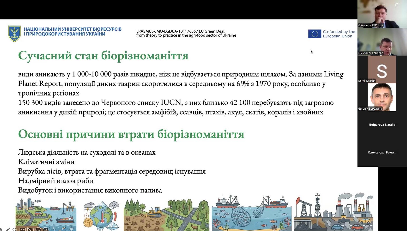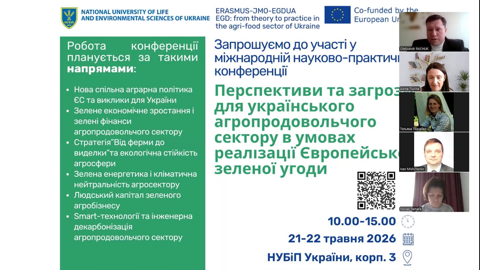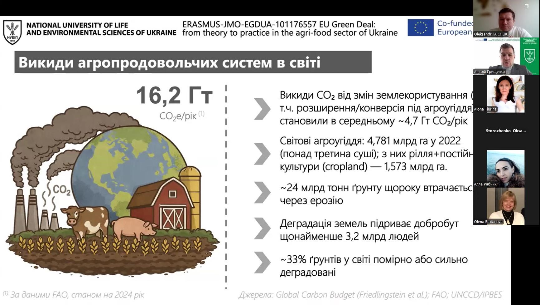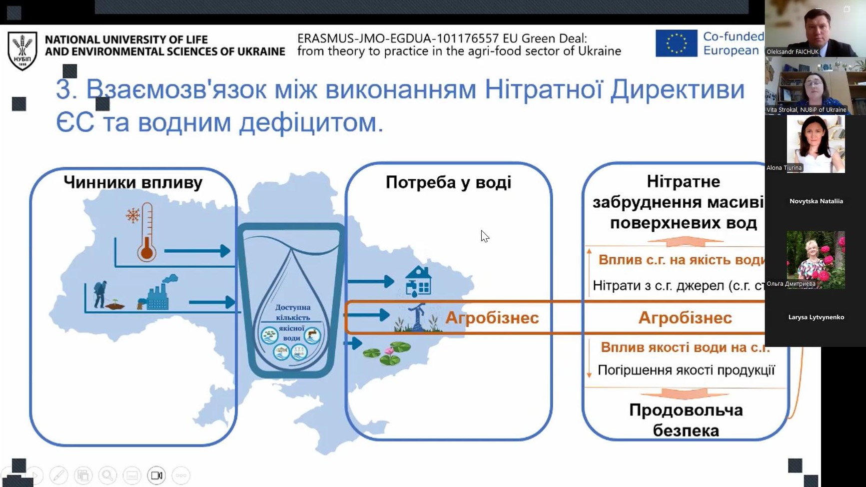 У період з 12 січня по 06 лютого 2026 р. в Національному університеті біоресурсів і природокористування України у форматі Міжнародної зимової школи проходило надзвичайно цікаве й актуальне навчання щодо викликів для агропродовольчого сектору України в рамках реалізації Європейського зеленого курсу. Зимова школа є одним із ключових заходів імплементації проєкту Erasmus+ Модуль Жана Моне «Європейський зелений курс: від теорії до практики в агропродовольчому секторі України» 101176557 – EGDUA – ERASMUS-JMO-2024-HEI-TCH-RSCH і підтримується Європейським Союзом. Варто зазначити, що у навчанні прийняли участь близько півтисячі учасників з освітянської і наукової спільнот, органів державної влади, бізнесу і громадянського суспільства з різних куточків України.