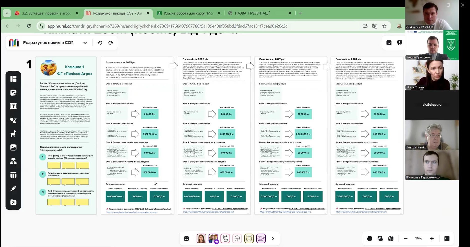 Ключовою особливістю двох тижнів інтенсивного навчання стало вміле поєднання спікерами теоретичного матеріалу із практичними завданнями. Зокрема, захопливою була робота в групах під час вивчення питань третього блоку, присвяченому вуглецевим ринкам і проєктам. Тут Андрій ГРИЩЕНКО спільно із модератором Альоною ТЮРІНОЮ з використанням платформи Mural через симуляцію діяльності реального фермерського господарства навчали учасників оцінювати та розраховувати викиди CO₂, генерувати можливі управлінські рішення і сформувати розуміння шляхів переходу агропідприємства до кліматичної нейтральності та впливу сетйкхолдерів (держави, освітньо-накових установ, бізнесу і громадськості) на побудову сталої екосистеми.