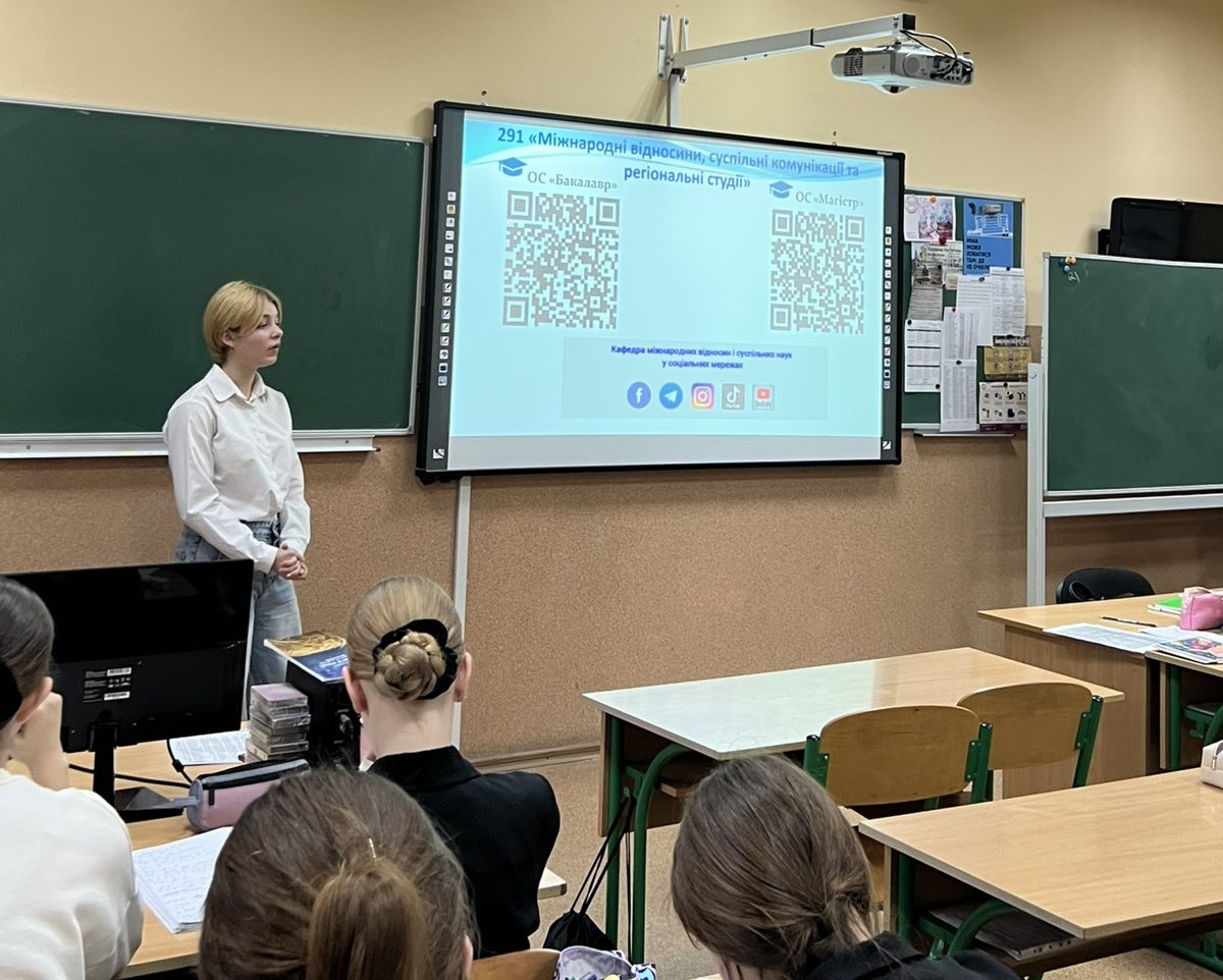 Використовуючи презентацію з інформацією шодо двох факультетів університету — гуманітарно-педагогічного й конструювання та дизайну — учнів поінформували про умови вступу на спеціальність С3 «Міжнародні відносини», зокрема про прохідний конкурсний бал, який становить не менше 150 балів. Окремо було надано інформацію про вартість навчання та можливості фінансової підтримки студентів з боку держави. Зокрема, неабияку увагу привернули відомості про державну грантову програму: вступники, які складуть дві дисципліни НМТ на рівні 170 балів і вище, можуть отримати державний освітній грант у розмірі 25 000 гривень щорічно для часткового покриття вартості навчання.