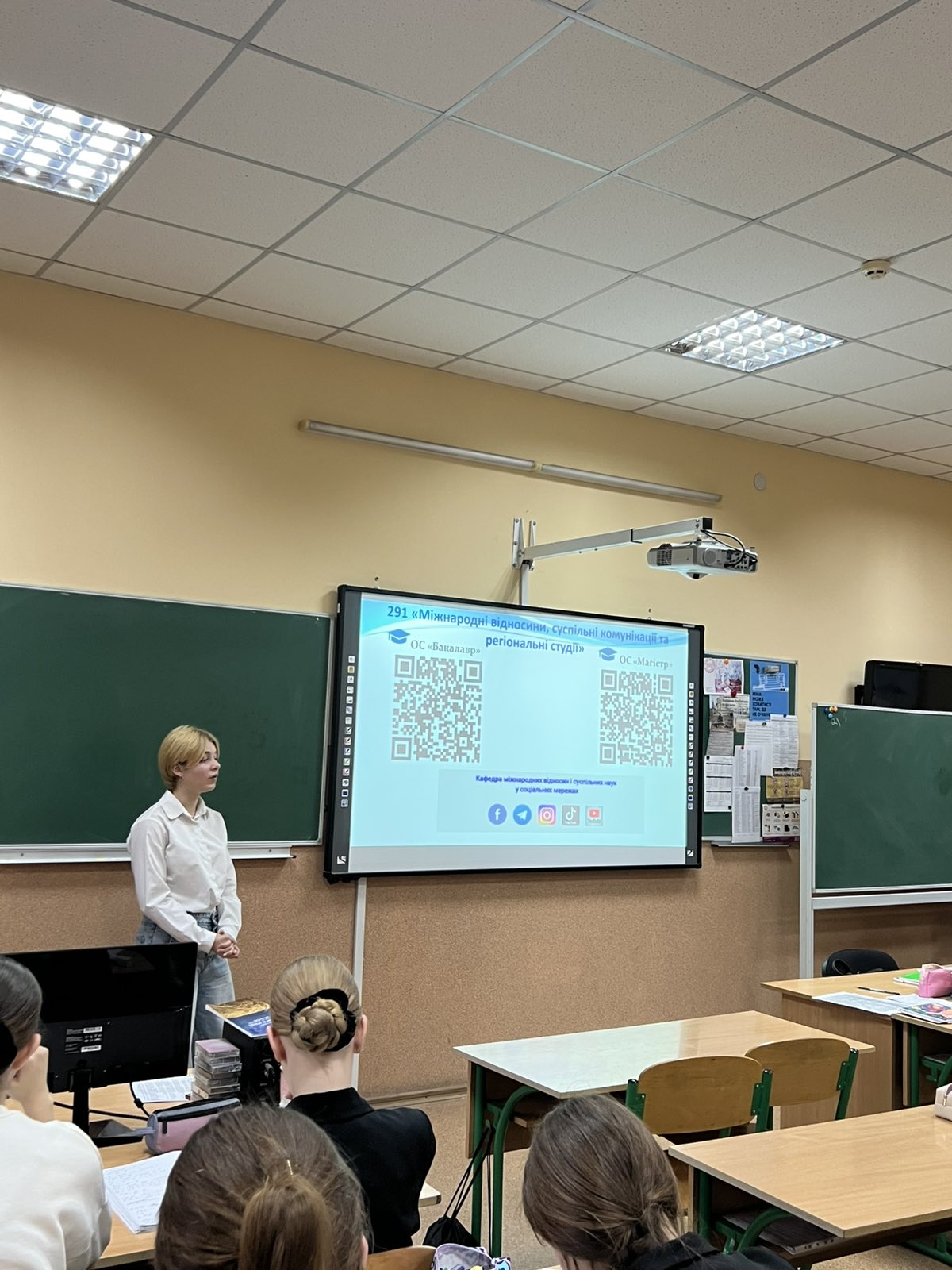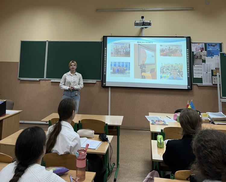 Використовуючи презентацію з інформацією шодо двох факультетів університету - гуманітарно-педагогічного й конструювання та дизайну – учнів поінформували про умови вступу на спеціальність С3 «Міжнародні відносини», зокрема про прохідний конкурсний бал, який становить не менше 150 балів. Окремо було надано інформацію про вартість навчання та можливості фінансової підтримки студентів з боку держави. Зокрема, неабияку увагу привернули відомості про державну грантову програму: вступники, які складуть дві дисципліни НМТ на рівні 170 балів і вище, можуть отримати державний освітній грант у розмірі 25 000 гривень щорічно для часткового покриття вартості навчання.