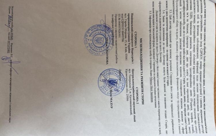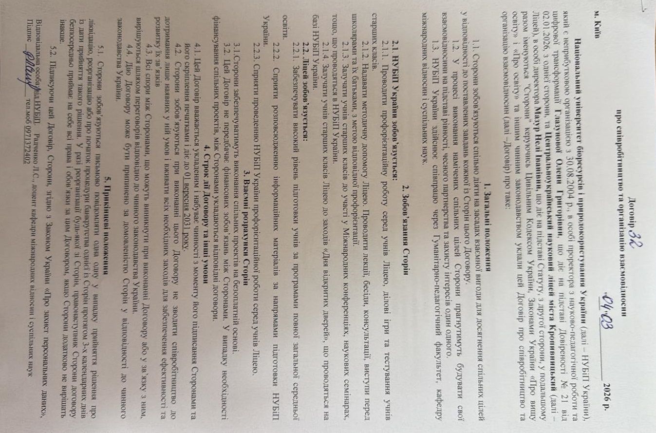 Важливим підсумком такого візиту стало підписання договору про співпрацю між Національним університетом біоресурсів і природокористування України та Центрально-українським науковим ліцеєм. Договір з боку ліцею підписала його директорка Неля Іванівна Мазур. Співпраця передбачає проведення спільних освітніх та профорієнтаційних заходів, публічних лекцій, зустрічей зі студентами та викладачами університету тощо.