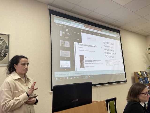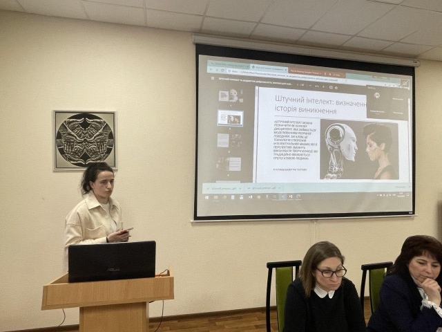 Наукову доповідь «Штучний інтелект та академічна доброчесність: виклики для освіти» членам ученої ради і всім присутнім спрезентувала доктор філософії старший викладач кафедри романо-германських мов і перекладу Юлія Молоткіна. В її доповіді висвітлено можливості використання штучного інтелекту у сфері гуманітарної освіти, особливо у галузях, які пов'язані з обробкою мови, аналізом текстів та візуалізацією даних (напр., Grammarly, Turnitin, Coursera, Word2Vec, Gephi та ін.), під час проведення занять. Юлія Олександрівна поділилася досвідом застосування одного з інструментів штучного інтелекту під час занять з англійської мови. Вона використала інструмент перефразування під час практики граматичної теми і відзначила позитивні аспекти використання ШІ під час заняття. Ці кейси ШІ допомігли не лише попрактикувати граматику, а й стали інструментом для розвитку навичок редагування та аналізу тексту. Штучний інтелект, зокрема чат ChatGPT можна використовувати під час занять з іноземної мови для: розмовної практики; практики перекладу; вивчення нової лексики; вивчення граматики; практики письма. Наголошено також на тому, що за умови дотримання етичних норм та принципів академічної доброчесності, а також за умови продуманої імплементації інструментів ШІ в освітню діяльність, технології ШІ можуть стати корисним доповненням до навчального процесу як для здобувачів, так і для НПП, а також для всіх стейкголдерів.