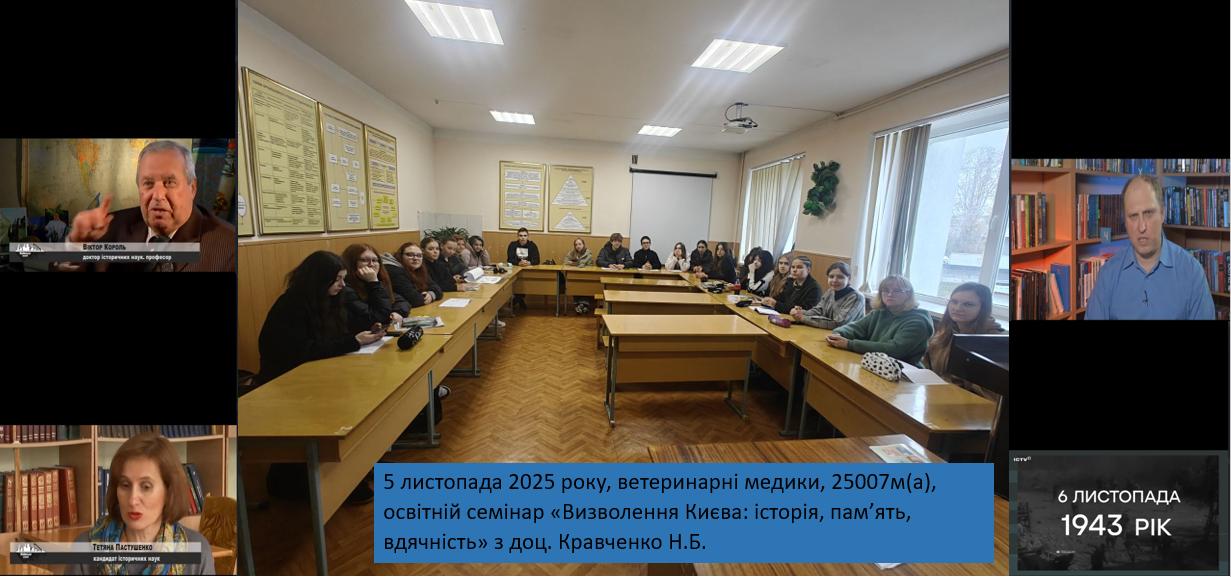 Ці та інші питання були у фокусі заходів, організованих викладачами кафедри міжнародних відносин і суспільних наук: Оленою Кропивко, Наталією Кравченко, Людмилою Лановюк, Богданом Грушецьким, Сергієм Біланом, Сергієм Асатуровим, Оленою Любовець, Оксаною Силкою. У заходах брали участь студенти 1-3 курсів спеціальності «міжнародні відносини», «туризм» та «готельно-ресторанна справа», «ветеринарна медицина», «землевпорядкування». У рамках семінарів «Визволення Києва: історія, пам’ять, вдячність» відбувся перегляд кінохроніки, презентація власних краєзнавчих досліджень, організація екскурсій до Національного музею другої світової війни, проведено паралелі із сьогоденням.