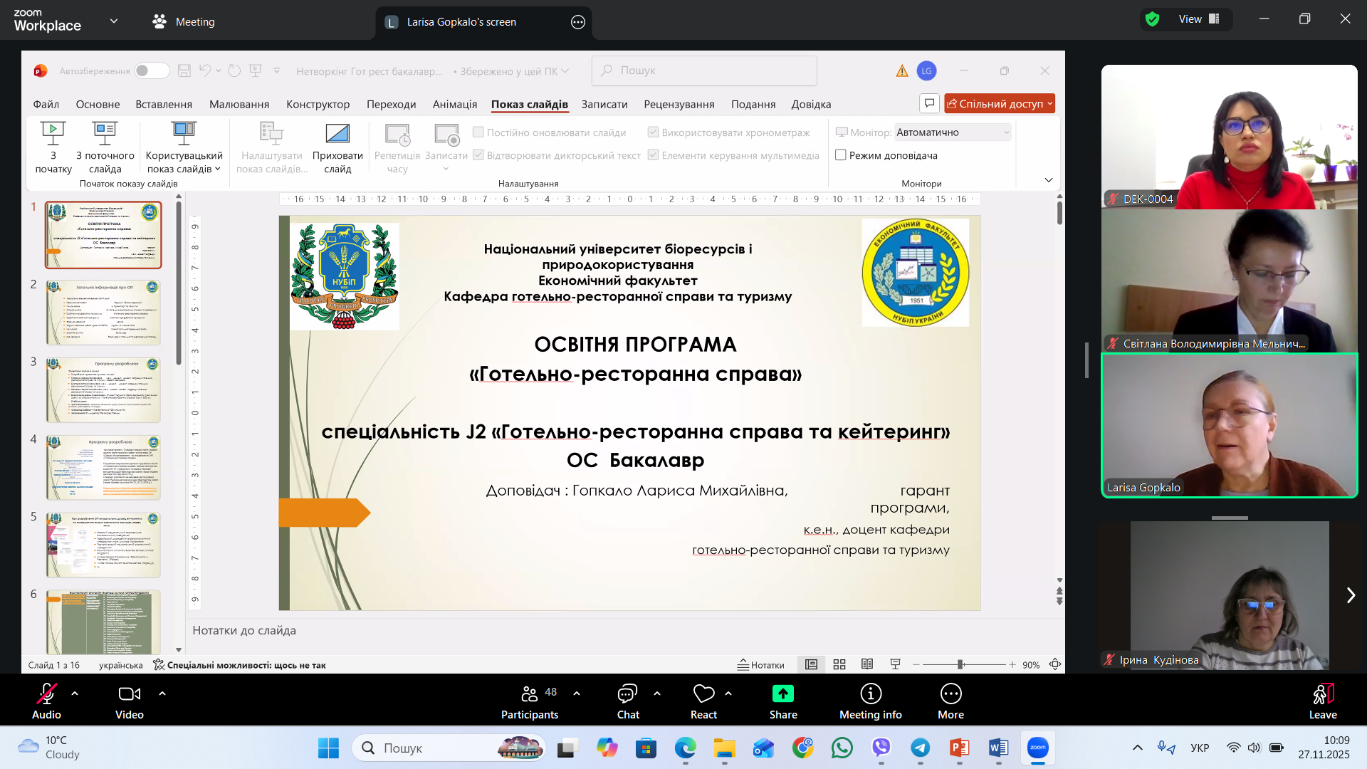 Гарант освітньо-професійної програми «Готельно-ресторанна справа» другого (магістерського) рівня НУБіП України Світлана МЕЛЬНИЧЕНКО повідомила присутніх про те, що отримано сертифікат про акредитацію ОП і проходження на даному етапі внутрішньої процедури постакредитаційного моніторингу. Відповідно до Постанови Кабінету Міністрів України про внесення змін до переліку галузі знань і спеціальностей, а також дотримання відповідності назви освітньої програми спеціальності, уточнено назву освітньої програми. У зв’язку з цим, уточнено назви обов’язкових і вибіркових освітніх компонент. Зроблено акцент на формуванні фахових компетентностей у здобувачів вищої освіти з урахуванням євроінтеграційних процесів, цифровізації та сталого розвитку. Такий підхід забезпечується через викладання дисциплін «Діджиталізація в готельно-ресторанному господарстві», «Бізнес-планування осель сільського зеленого туризму», «Еко-тренди в готельно-ресторанному господарстві». Враховуючи вимоги стандарту, навчальним планом передбачено вивчення обов’язкових і вибіркових освітніх компонент у 1 і 2 семестрах. Виробнича (переддипломна) практика, підготовка та захист магістерських кваліфікаційних робіт передбачено в 3 семестрі. Це дає можливість здобувачам отримати ґрунтовні практичні знання та навички, вивчити діяльність підприємства, що є базовим для виконання магістерської роботи. Під час виступу гарантом акцентовано увагу на академічній мобільності та необхідності укладання договорів про співробітництво між вітчизняними закладами вищої освіти (внутрішня мобільність).