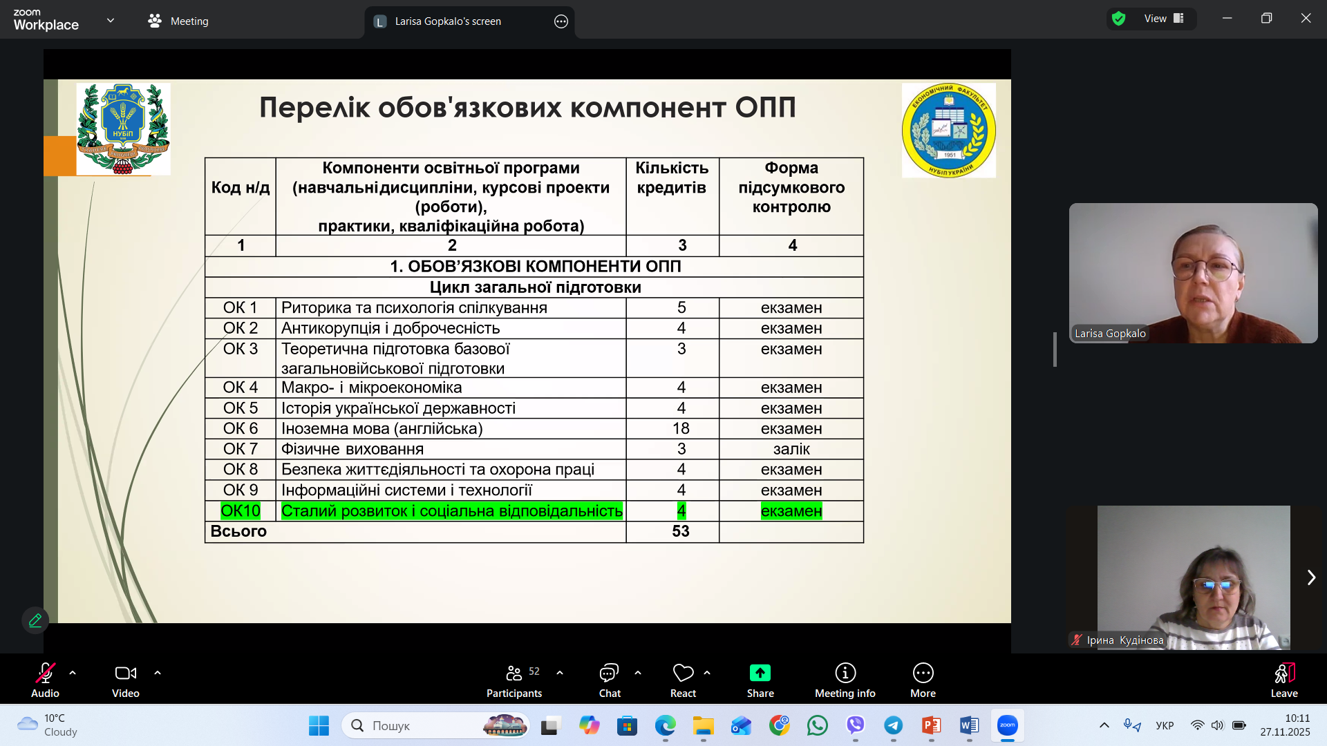 Олександра КОБІЙЧУК, здобувачка вищої освіти 3 року навчання за спеціальністю «Туризм і рекреація», висловила спільну думку одногрупників і повідомила, що за результатами опанування освітніх компонент відбувається зустріч із завідувачкою кафедри та гарантом освітньої програми щодо навчального процесу. Пропозиції, які висловлюють студенти переважно враховуються під час формування ОП нового року вступу. Приємно, що до наших пропозицій дослуховуються.