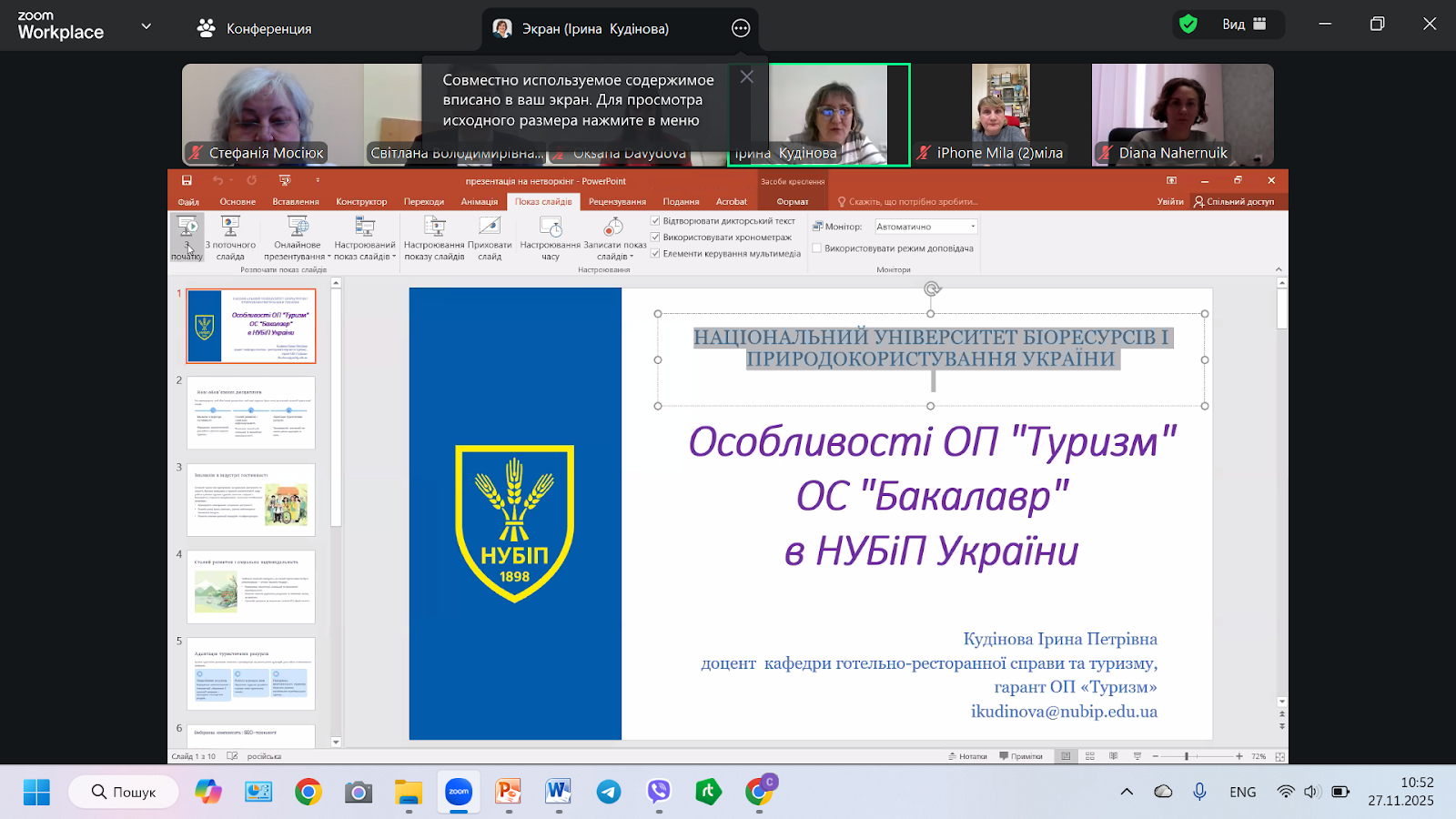 Гарант освітньої програми «Туризм» першого (бакалаврського) рівня освіти НУБіП України Ірина КУДІНОВА повідомила про оновлені елементи ОП. Зазначено, що стратегічними нововведеннями для покращення якості освіти та підготовки фахівців за даною освітньою програмою є: посилення практичної складової, акцент на елементи дуальної освіти, інтеграція цифрових навичок. Введено нові обов’язкові компоненти. Сучасний туризм має ґрунтуватися на принципах доступності та рівності. Важливо формувати у студентів компетентності щодо роботи з різними групами туристів, включно з людьми з інвалідністю, туристами старшого віку та гостями з особливими потребами; відповідність міжнародним стандартам доступності; потреба ринку праці у фахівцях, здатних забезпечувати інклюзивні послуги; розвиток навичок адаптації маршрутів та інфраструктури стали підгрунтям для введення дисципліни «Інклюзія в індустрії гостинності». Формування у здобувачів екологічної, соціальної та економічної відповідальності; розвиток навичок управління ресурсами та мінімізації впливу на довкілля; адаптація програми до актуальних політик ЄС у сфері сталості вплинули на рішення введення освітньої компоненти «Сталий розвиток і соціальна відповідальність». Передбачено викладання дисципліни «Адаптація туристичних ресурсів», оскільки виникла необхідність формування компетентностей з інтерпретації, збереження й адаптації природних, культурних та історичних ресурсів; підготовки здобувачів до роботи в умовах зміни туристичних потоків; підтримки розвитку внутрішнього та регіонального туризму. Проєктною групою прийнято рішення щодо введення вибіркової освітньої компоненти «SEO-технології», оскільки роботодавці потребують фахівців, які вміють просувати продукти туризму онлайн; формування компетентності у сфері контент-маркетингу, оптимізації сайтів, аналітики та роботи з цифровими платформами.