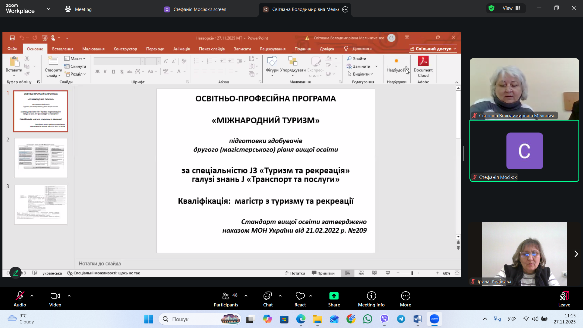 Жваве обговорення викликала освітньо-професійна програма «Міжнародний туризм» на другому (магістерському) рівні у НУБіП України, гарантом якої є Стефанія МОСІЮК. Дана ОП спрямована на підготовку фахівців, здатних працювати в динамічному глобальному середовищі. Гарант зазначила про уточнення назви освітньої програми. Попередня назва «Міжнародний туристичний бізнес» не відповідає зазначеній галузі знань та спеціальності. У зв’язку з цим, уточнено назви освітніх компонент. Вступ України до Європейського Союзу, потребує врахування євроінтеграційних процесів у підготовці кадрів, які будуть затребувані міжнародною спільнотою, а також формувати компетентності у здобувачів, які дадуть можливість організувати власний бізнес конкурентний на внутрішньому і міжнародному ринку туристичних послуг. Враховуючи вищезазначене до переліку вибіркових компонент введено дисципліни «Підприємництво» і «Соціальна відповідальність міжнародного бізнесу».