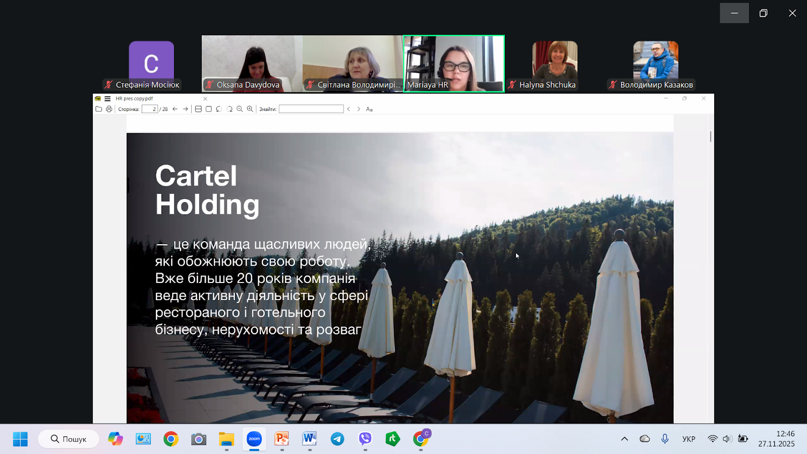 Марія КАЛЬНИШЕВСЬКА, HR менеджерка компанії Cartel, наголосила на важливості практичної складової у підготовці фахівців індустрії гостинності та розповіла про особливості організації готельно-ресторанного бізнесу компанії.