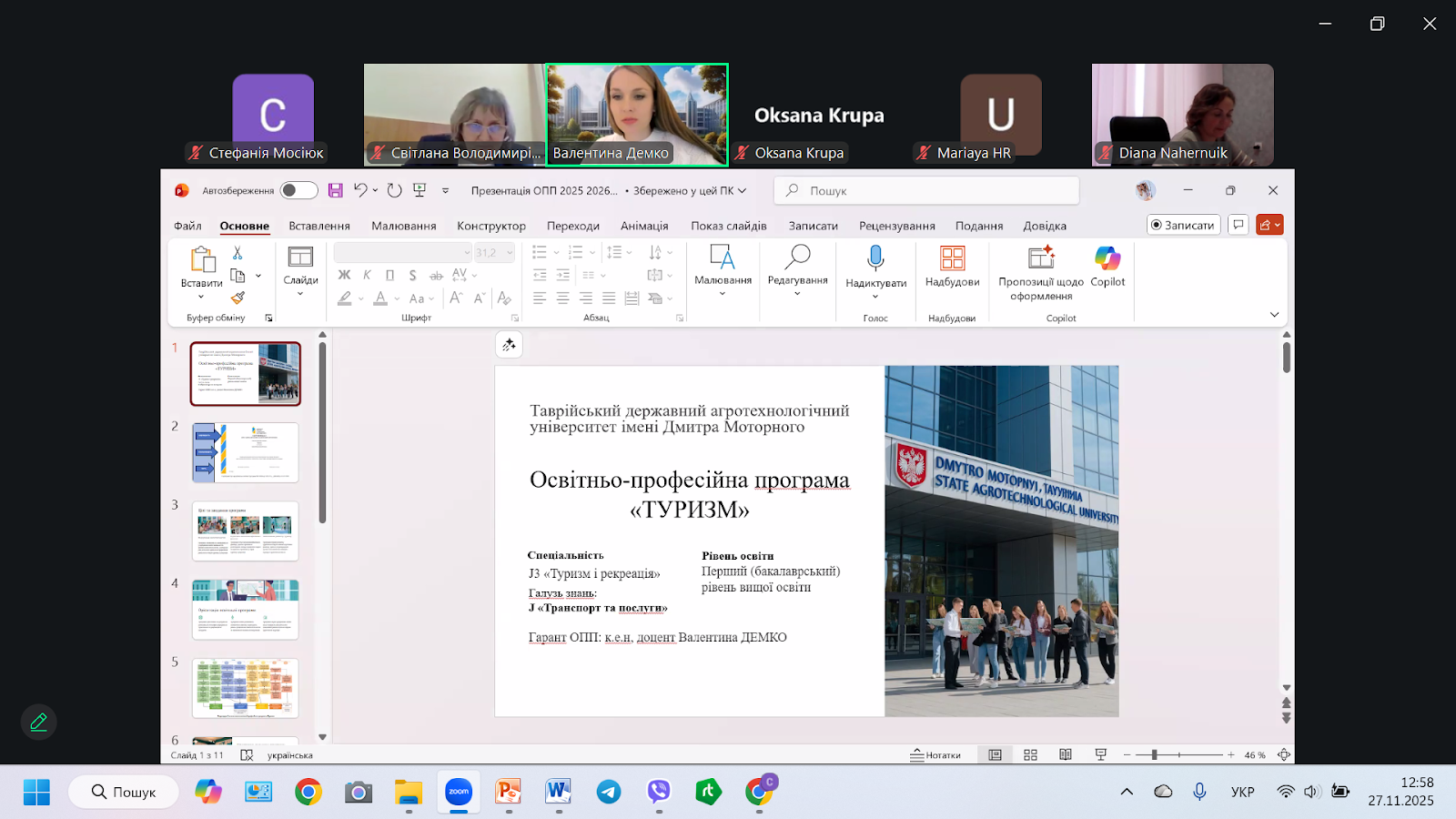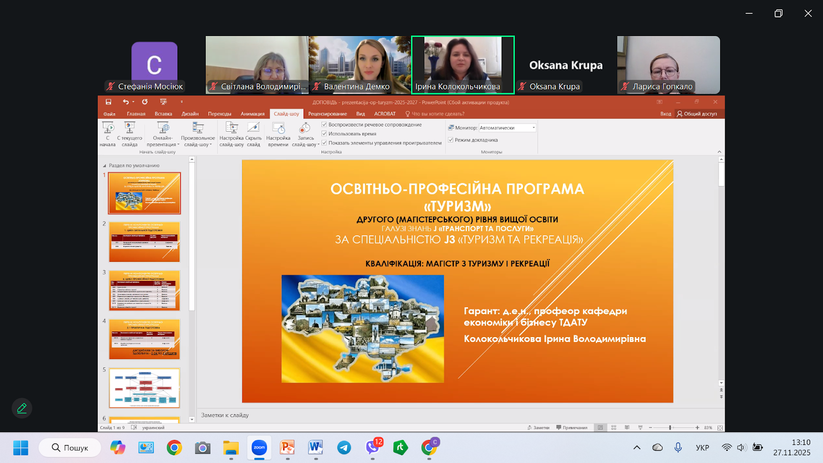 Валентина ДЕМКО, доцентка кафедри економіки і бізнесу Таврійського державного агротехнологічного університету імені Дмитра Моторного виступила з інформацією про особливості формування ОП «Туризм» на освітньому рівні «Бакалавр».