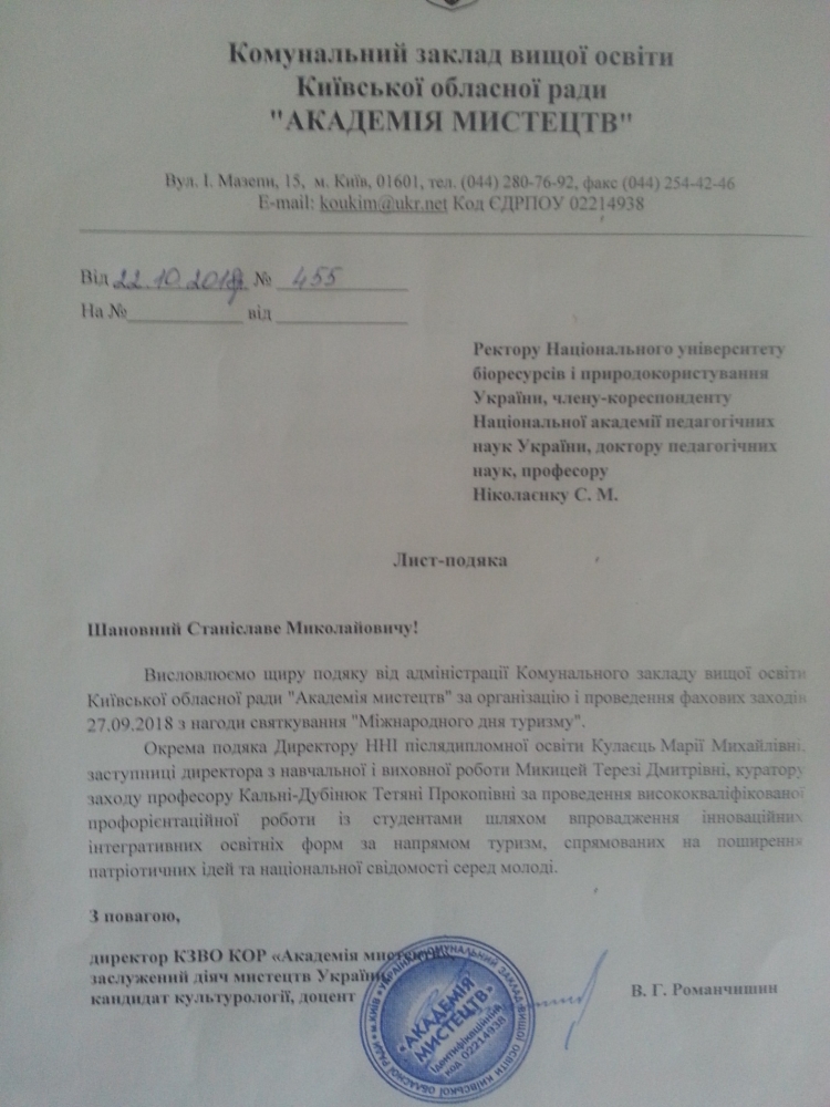 На ім’я ректору НУБіП України Ніколаєнка С.М. нещодавно надійшов лист-подяка від директора Київського закладу вищої освіти «Академія Мистецтв», заслуженого діяча мистецтв України Романчишина В.Г. за організацію і проведення фахових заходів з нагоди святкування «Міжнародного Дня Туризму».