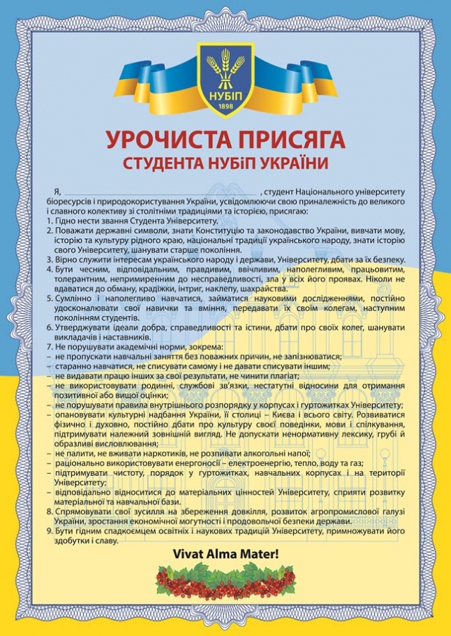 Після вітальних промов та настанов студенти промовили присягу студента НУБіП України, яку вже упродовж багатьох років традиційно промовляють всі студенти, які розпочинають навчання в нашому університеті.