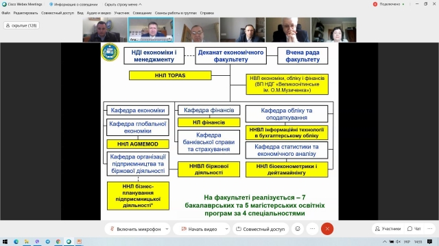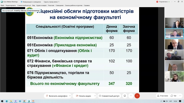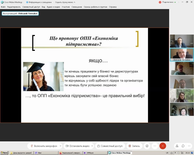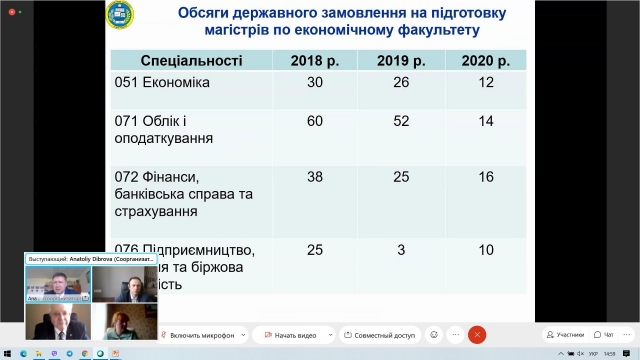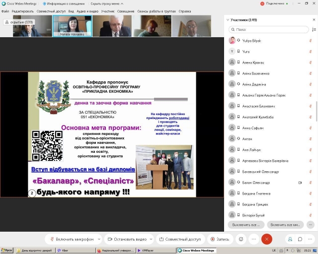 Після зустрічі з керівництвом Університету на загальноуніверситетському блоці програми, усі бажаючі мали змогу познайомитися з економічним факультетом, поспілкуватися з представниками адміністрації та отримати відповіді на питання, які їх цікавили, а також віртуально ознайомитися з матеріально-технічною базою факультету. З вітальним словом і короткою інформацією про факультет до усіх присутніх, а їх було майже 160 осіб, звернувся декан факультету Анатолій Діброва, який у своєму виступі розповів про структуру факультету, його кадровий потенціал та надав інформацію про всі кафедри. Він розповів про спеціальності, за якими здійснюється підготовка фахівців на факультеті, про переваги навчання у нашому ЗВО та наголосив, що факультет є одним з кращих на території нашої країни, і студенти, які тут навчаються, теж найкращі.