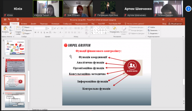 Про фінансовий контролінг в сучасній компанії розповіла Вікторія Цесар, спеціаліст фахівець відділу фінансового контролінгу та консолідації компанії ТОВ «Імпел Гріффін Груп». Розповіла про специфіку діяльності своєї компанії а також вказала перелік робіт, що виконує спеціаліст відділу фінансового контролінгу, а саме: робота з банківськими продуктами (кредити, овердрафт), калькуляція клієнтів в системі 1С: Підприємство, робота в Pay Service і Cash Service, аналіз собівартості по регіонах, робота із зарплатними проектами.