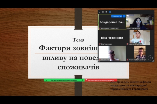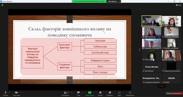 Під час лекції Віолетою Гераймович розглянуто та проаналізовано фактори зовнішнього впливу на купівельну поведінку споживачів, було приділено особливу увагу маркетинговим дослідженням зовнішніх факторів які впливають на поведінку споживачів, з метою визначення на що звертає увагу клієнт при виборі товарів магазину. Завдяки ілюстраціям та прикладам з практики, студенти глибше розуміли та сприймали важливість факторів, які впливають на поведінку споживачів.