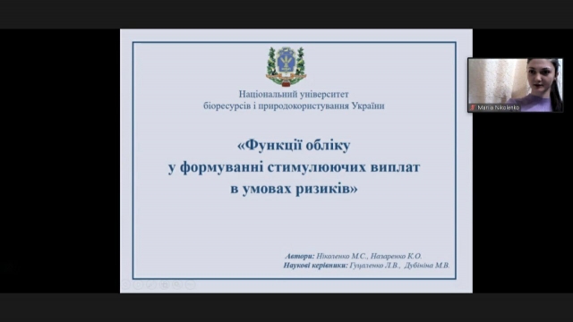 Здобувачі другого (магістерського) рівня вищої освіти Марія Ніколенко (НУБІП) та Катерина Назаренко (МНАУ), які під спільним керівництвом д.е.н., проф. Гуцаленко Л.В. (НУБІП) та д.е.н., проф. Дубініної М.В. (МНАУ) представили дослідження на тему: «Функції обліку у формуванні стимулюючих виплат в умовах ризиків».