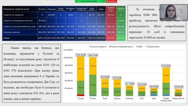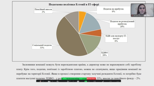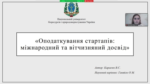 Студентка 4 курсу Вікторія Карасюк, під керівництвом к.е.н., доц. Ганяйло ОМ., представила неординарне дослідження на тему «Оподаткування стартапів: міжнародний та національний досвід». Метою дослідження стало вивчення тенденцій розвитку стартапів та особливостей їх оподаткування в Україні та світі, зокрема, визначено перелік проблем, які потребують державної підтримки для покращення інноваційної екосистеми для стартапів в Україні. Проаналізувавши діючі системи оподаткування стартапів в Україні та проблеми, які мають місце при застосуванні загальної і спрощеної системи оподаткування та нового для України податкового режиму Дія Сіty, обґрунтовано пропозиції, що дозволять стартапам обирати оптимальну систему оподаткування та приймати обґрунтовані управлінські рішення.