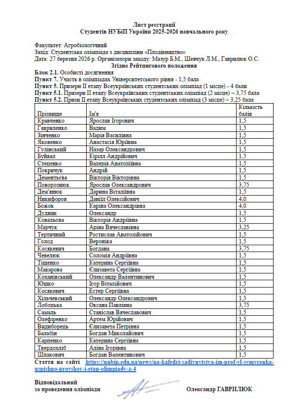 Олімпіада з дисципліни «Плодівництво» проходила дистанційно на платформі «Оlympus» 27 березня 2026 року.