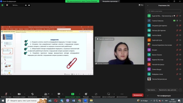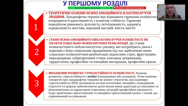 Вдало були захищені теми неординарного характеру: «Соціально-психологічна реабілітація науково-педагогічних працівників засобами ландшафтної терапії» (виконавець Альона Альтанова, керівник Ірина Сопівник) та «Соціально-психологічна реабілітація військовослужбовців засобами каністерапії» (виконавець Ганна Файдевич, керівник Ніна Тверезовська).