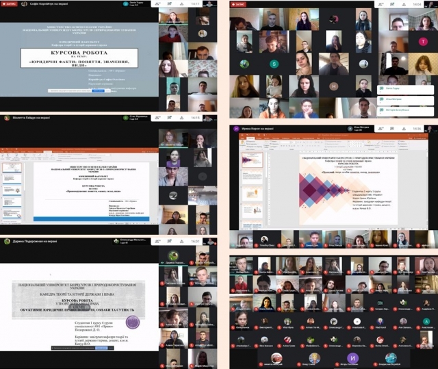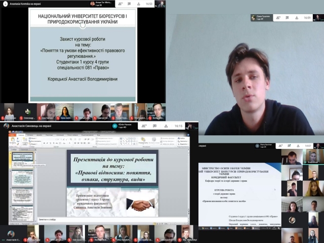 Уже другий день поспіль на кафедрі тривають онлайн-захисти курсових робіт студентами 1 курсу юридичного факультету денної форми навчання (платформа Meet) з навчальної дисципліни «Теорія держави і права». Під час захисту вони коротко висвітлюють зміст роботи (до 5 хв.), відповідають на поставлені колегами запитання, а члени комісії оцінюють їхні захисти. При цьому враховується повнота викладу теми, правильність висвітлення питань, вміння відповідати на питання та дискутувати.
