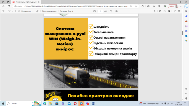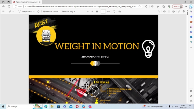 Українська транспортна система є важливим стовпом розвитку національної економіки, і ефективне функціонування цієї системи вимагає не лише якісної інфраструктури, але й сучасних технологічних рішень для забезпечення безпеки і ефективності перевезень. У цьому контексті зважування в русі (Wim - Weigh-in-Motion) відіграє важливу роль у забезпеченні безпеки дорожнього руху та збереженні дорожнього покриття. В Україні ця технологія набуває все більшого значення, і це було важливою темою на лекції, проведеній представниками Державної служби (Укртрансбезпека) для студентів спеціальності "Транспортні технології на автомобільному транспорті". Лекція проводилась у змішаному форматі ( це понад 50 студентів).