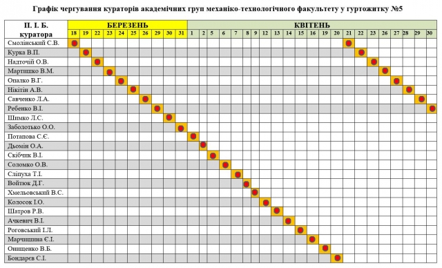 Заступник декана, Ігор Сівак, висвітлив, для обговорення, розроблений графік чергування наставників академічних груп у гуртожитку № 5, на березень – квітень поточного семестру.